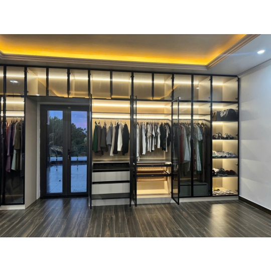 Cánh kính cường lực với khung nhôm cao cấp mang lại vẻ đẹp thanh thoát, hiện đại, xóa bỏ cảm giác nặng nề, bí bách thường thấy ở các loại tủ gỗ truyền thống. Chúng biến bộ sưu tập quần áo, phụ kiện của bạn thành một phòng trưng bày cá nhân (personal showroom).